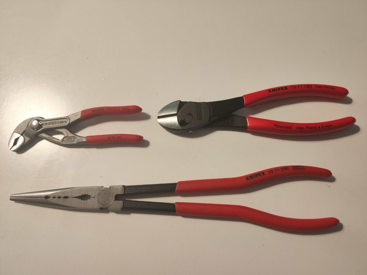 Kot obljubljeno...danes prišla pošiljka...spet nekaj od Knipex-a...pa gremo lepo po vrsti,k se je že nabralo😄....upam,da bo za koga zanimivo. K sem že lani maja naročil set za Seger varovalke,in tukaj še nisem predstavil...super set za lepo ceno...novejši tip z notranjo vzmetjo....pa mi je manjkaj najmanjši tip za zunanje majše od 10mm...in k pogosto kaj kupujem na nemškem Amazonu...imam določene stvari na opazovanju,in gre kdaj kakšna stvar v košarico,toliko,da je za "free shipping"...pač bolje dobiti klešče,kot pa plačati poštnino. Pa sem vzel tanajmanjše 49 11 A0 3-10mm...je bila lepa cena 16,78€😃 https://www.amazon.de/dp/B0001P0C84?ref=ppx_yo2ov_dt_b_fed_asin_title&th=1 Ta set pa kot rečeno imam že od Maja lani...top stvar,če potrebuješ👍...seveda obstaja tudi kaj mnogo cenejšega...pa ne bom debatiral o tem...🙄 Takrat 73,57€👍 https://www.amazon.de/dp/B000CDU2RG?th=1 kak mesec nazaj,pa sem na isto foro..."klešče namesto poštnine"😄 vzel majhne malce posebne "kombinirke"...če bi vedel,kako super so,bi jih vzel že prej...res priročne-padejo v roke k "ata na mamo"...17,53€👍 Izgleda,da jih je Amazonu zmanjkalo,in je takoj "druga cena"🧐...kogar zanima-daš v basket in shraniš za kasneje,in vsake toliko časa pogledaš,kako se giba cena... https://www.amazon.de/dp/B0C77B4J1B Sedaj pa k "posebnežu" za električarje. Univerzalne klešče za instalacije....obstaja več različnih variant,tako glede ročajev,kot "opreme čeljusti" in tudi "imperialna in metrična verzija. Določene imperijalne imajo luknje za rezanje vijakov (ne potrebujem),in doličene imajo tudi mesto za stiskanje "crimp-tulk",in obstajajo verzije z vzmetjo,in brez. "Moja" je metrična verzija z navadnimi ročaji,brez vzmeti,brez lukenj za vijake in brez možnosti crimpanja....prav namenoma izbrana takšna varianta,ker sem mnenja,da npr. crimpanje "tako-tako" (ker je samo za eno velikost,pa še to na "trn") ni najbolj optimalno...bolje z več "trni" ali pa klešče za stiskanje celega oboda (kvadratni ali hex-profil). Sem se pa odločil za te klešče zaradi težav pri ožičanju starih instalacij. Praktično zmeraj (razem štedilnik) za instalacije uporabljam mehke kable...a hiša je stara,in vsa stara elektro instalacija je izvedena z trdimi kabli. Tukaj pa je težava z orodji za snemanje izolacije-Weicon Tools No.5 https://www.amazon.de/dp/B001NUMVHQ?ref=ppx_yo2ov_dt_b_fed_asin_title&th=1 In Weicon Tools Multi-Stripper No. 400 (obstaja tudi identičen Cimco-Multistripper,ki mi lepo služi že kakih 15-20 let😃👍) https://www.amazon.de/dp/B003A6DHTW?ref=ppx_yo2ov_dt_b_fed_asin_title&th=1 Vsi trije res vrhunski-zelooo priporočam....a le za mehke kable!!! To pa za to,ker ko žico trdega kabla prerežeš-odščipneš,se konec tako preoblikuje,da nastane majhna sploščitev,in dve stranske "špice" na žici...te špice pa slej ko prej poškodujejo rezila teh snemalcev izolacije. 3x lahko ugibate,kako to vem...🥺 In pri tem tipu klešč za izolacijo teh problemov ni...za to ta nakup. Kar so te klešče prišle ven,je bila cena skoz okoli 50€,sedaj pa počasi pada,in sem vzel za 38,98€ https://www.amazon.de/dp/B0C8P81PTF Just a moment... WWW.KNIPEX.DE In še ene "posebne" klešče,ki jih še nisem predstavil...dolge,tanke "montažne" klešče z velikim prenosom in špičasto konico...izgledajo "čudno",a so fenomenalne in presenetljivo močne...za 25,99€ tudi na Amazonu...sem jih kupil takrat,kot tiste posebne ščipalke z posebnim drsnimrotacijskim ležajem....obstajajo tudi "ukrivljene" če koga zanima. KNIPEX Montierzange mit Querprofilen mit Kunststoff überzogen 280 mm, 28 71 280 : Amazon.de: Baumarkt WWW.AMAZON.DE Elektro- und Handwerkzeuge online - KNIPEX Montierzange mit Querprofilen mit Kunststoff überzogen 280 mm, 28 71 280. KNIPEX... Just a moment... WWW.KNIPEX.DE Za konec pa še en "veliki malček" t.i. Super-Knips XL 78 61 140 To je večja močnejša verzija klasičnih elektroničarskih ščipalnih klešč...zmorejo tudi kakšne debelejše nožice tranzistorjev ipd... Z vzmetjo,obstaja tudi INOX verzija... 20,99€ Amazon https://www.amazon.de/dp/B06WD7BMR9?ref=ppx_yo2ov_dt_b_fed_asin_title&th=1 Just a moment... WWW.KNIPEX.DE Dost nakladanja...sedaj pa slike😉 Mislim,da bo božiček imel dovolj idej...😄😉