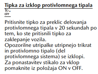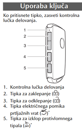 Prvič slišim, da imamo na CX-30 vgrajeni alarm. Kolikor vem je serijsko samo blokada motorja, ki pa ne tuli in ni v smislu kot alarm in kot na tem video. To je verjetno dodatna oprema, ali najvišja oprema Takumi ali za kaki drugi trg ?. Po moje je to za ameriški trg, ker npr. tam imajo tudi odpiranje vseh štirih oken naenkrat, v Evropi pa ne... Kolikor sem preveril do sedaj bi potem morala biti na ključu še tipka za izklop alarm senzor (glej spodnjo sliko) in vidno na tem video, .... Izklop/vklop alarma na video, ko pritisne spodnji gumb, ki pa ga pri meni ni na ključu, je samo gumb za odpiranje, za zapiranje in za električni prtljažnik (višja oprema). Potem bi moral biti v tem primeru še četrti gumb za alarm. Sem pa preveril v Slo konfiguraturju in tam je res pri vseh modelih, tudi osnovnem Prime line pod Varnost navedeno Protivlomni alarmni sistem, to pa mi ni jasno, ker na ključih ni tipke alarm številka 5 po sliki, verjetno imajo narobe napisano? Sergeja, ali je na tvojem ključu spodnja tipka številka 5 za alarm kot v tem video in priloženi sliki? Pa še spodaj navodila za izklop senzorja, preveri... -