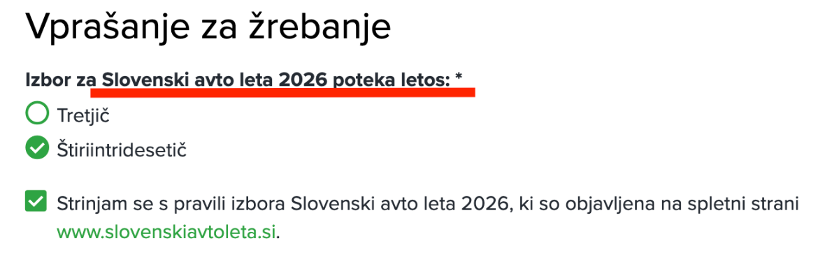 hvala da si objavil link, bom sodeloval v nagradni igri čeprav ne razumem čist točno odgovorov - sprašujejo namreč, kolikotič poteka izbor za slovenski avto leta 2026 pomoje prvič in edinkrat za 2026???? null
