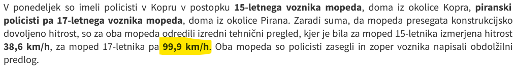 2. A ja? Z avtom, verjamem, če pogledaš, je stalno gužva na cesti med Lucijo in Koprom, nimaš kje rasterat. Če pa pogledaš 25-ke ... Verjetno je naprava zmožna preverjat hitrost samo do 99,9, verjamem, da je šel več. Mularija vgrajuje kite 70cc, mašine od 150, 172, 200cc na ogrodja Piaggio Zip, ki je skonstruiran za 25 km/h. Redko kdo nadgradi še bremze ali da gor boljše gume. Pravi smrtonosni projektili. Zakaj? Zato, ker lahko, bi rekli ...