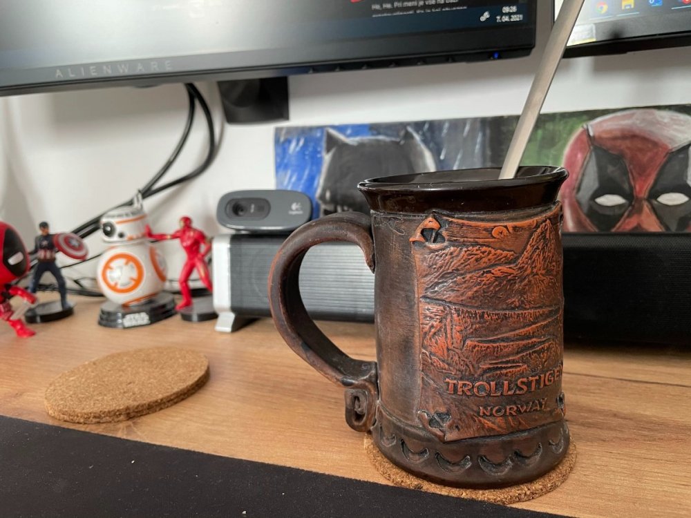 Pa se moj "Morning Cup-of-Joe", precej tipicno odkar delamo od doma... PS: V ozadju lahko opazite del moje kolekcije figuric superjunakov! Sicer ce vprasate mojo, ona to klice "nabiralci prahu"......
