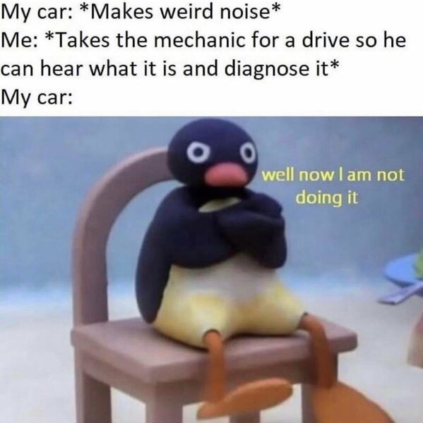 No sem šel do mehanika, na poti tja je ropotalo potem se usedeva in na zacetku tisina (zgledalo nekako tako kot spodaj v sliki 😄 ). no pol je pa zacelo ropotat, sva prisla pred delavnico je mehanik vzel moment kljuc pa sel pregledat vsa kolesa - ugotovljeno da prednje levo kolo ni bilo do konca zategnjeno oz. se je losalo. Je rekel imas popravljeno pelji... no na poti domov se zvok ni pojavil, upam da bo to. preden bi kdo napadel kako nisem to gledal, naj povem da je bil avto dvakrat na dvigalu pri dveh mehanikih in so premikal vse spodaj, tudi sam sem pri parkiranem vozilu gume tresel ce bi se kaj slisalo pa nic... no preventivno pa res nikoli nisem zategoval vijakov, ze 20 let vozim pa mi jih nikoli ni bilo treba. lp -