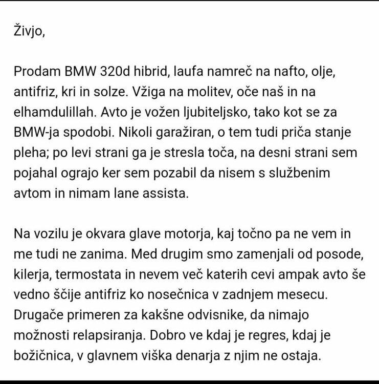 Bi se lahko reklo ja😂. Najboljš je bilo ko sva šla z drago na morje in nisem smel ugasniti avta, ko je bil ogret, ker se potem ni prižgal..na kavi po poti sem pač tako parkiral, da je bla alfa poleg pa prižgana, na trajektu mi pa niso pustili, da ga ne ugasnem, pa še v spodnji del trajekta sem moral zapeljati.. itak ni vžgala ko smo prišli do Cresa, vsi so mi trobili naj se umaknem, avto ni hotel vžgati..na koncu, ko so že vsi zapeljali s trajekta, so vsi zaposleni na trajektu porivali avto in ko je vžgal veselo ploskali 🙈😂.