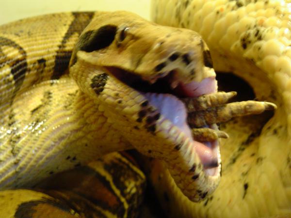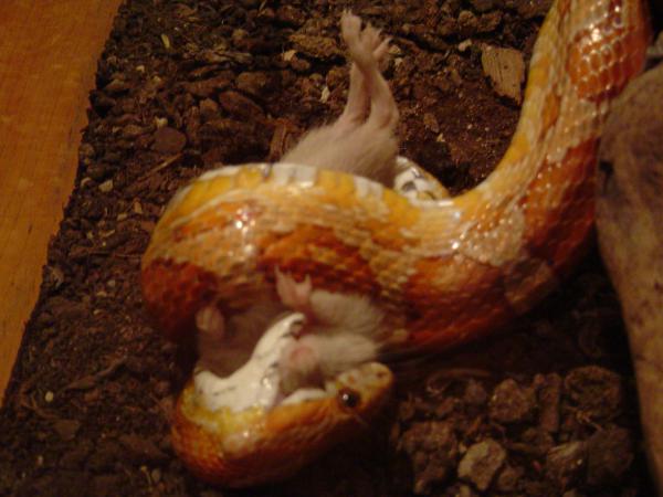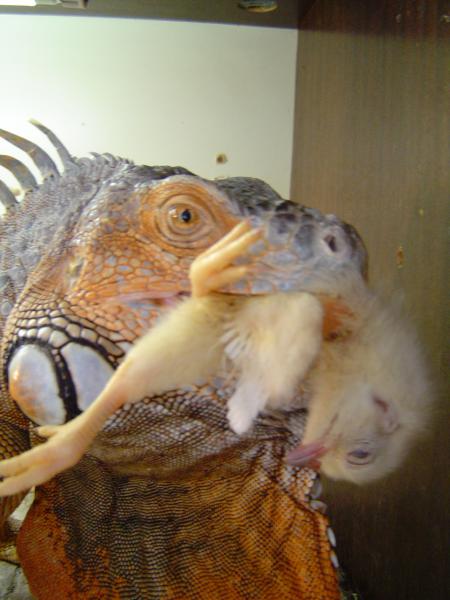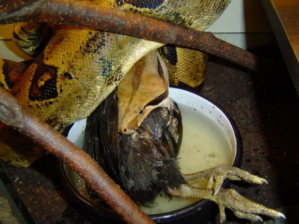 Jah tkole je no - kenguruji glih niso na meniju, ker je ?e premejhna, ampak vse kar je velikosti zajca in je kosmato ali pernato - boa ni glih preve? zbir?na. Piton?ek se je pa specijaliziral samo na pu??avske skaka?e in no?e jest drugega. Ku??arja mam navadno na zelenjavno/sadni dijeti (izjemoma Iguana dobi meso - na sliki). Pajki in ?korpijoni pa jedo ?u?ke, ki se jih pa lepo kupi v Zootiku. Rad imam pa? doma?e ?ivali, ki niso tako odvisne od lastnika, da bi jih bilo treba vsak dan peljat na sprehod (edino psa Bena vozi tut brat in fotr) in si lahko ?lovek privo??i 2-3 tedenske po?itnice in elektronika skrbi za vse... Dam nekaj slikic prehranjevanja, ki so politi?no ''korektne'' - beri na njih ni videti ?ivali (za hrano), ki jih imate ziher kateri za doma?e ljubljen?ke... ?e bo kogarkoli interesiralo slikanje ali poziranje (za se hvalit kolegom) s kako manj?o ka?ico (3,5m) se da zmenit, ker poleti gre Freyja (boa constrictor) ponavadi z mano kam na izlet v naravo... sploh zdej ko mam karavana ne bo to ve? noben problem... Brez skrbi v moji oskrbi od dol?ine 22cm - torej udoma?eno in razvajeno in popolnoma nenevarno... sam ?e ti ne pade dol s sede?ne na nogo... Lep dan Kuscar