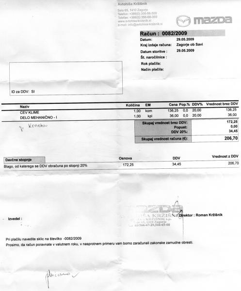 Evo popravilo glede na prejsno napisano ,ki je bilo se neuradno! Danes so mi popravili klimo ker sem moral cakati na cev ki je ni bilo na zalogi! In evo zgoraj napisane cene so sedaj uradno take! Cev:136,25 ? brez ddv Delo:36? brez ddv Skupaj z ddv: 206,70? In kar mi je najbolj vsec mi ponovnega poljnjenja niso sploh zaracunali! Prilagam racun!Mislim da je to kar uredu cena da ni pretirano glede na zacetnih 300?!