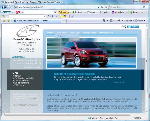 9. Ja takole je... po?asi se tudi ta projekt zaklju?uje in je pripravljen za objavo Po na?elu novo je bolje, smo se potrudili postaviti ?imbolj v?e?no a tudi koristno, informacij polno, ter sodobno stran, tako vas ?e vabimo na prvi ogled www.as-velenje.com Stran se sicer ?e dopolnjuje in je potrebna ?e kar nekaj dodelav, verjetno tudi kak?no odpravljanje napak ali kraj?i izpad. Pripravljena je predstavitev dveh trenutno najbolj aktualnih modelov Mazda2 in CX-7, prav tako trenutno zimske akcije, a se ?e veselimo in pripravljamo na prihod nove Mazde6 Upamo, da vam bo stran v?e?, komentarji/kritike/predlogi seveda dobrodo?li Z najlep?imi pozdravi iz Velenja! Wildcat in celotna ekipa Mazda AS Velenje