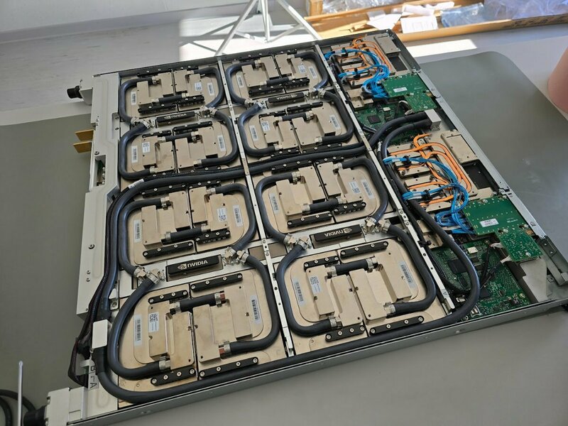 A ne ne amper tehnologija je zgolj za igrice, in je že stara 3 generacije.....potem je bil Hopper, danes je pa že Blackwell....ampak to je popolnoma drug svet, ki ga ne moreš enačiti, čeprav je bazirana na Hopper tehnologiji, a povsem druga mikroarhitektura nvidia H200 je tole na sliki, Tensor jedro NVIDIA H200 Tensor Core GPU WWW.NVIDIA.COM The H200’s larger and faster memory fuels the acceleration of generative AI and LLMs while advancing scientific computing for HPC workloads. Na sliki so ALU waterbloki, te so v kontaktu s komponentami (preko posebnih termalnih padov, tudi ti so povsem nekaj drugega kot za računalnike) glycol pa teče čez water block. Po domače radiator Ampak glycol je posebne vrste ker je treba paziti na kemijske reakcije elementov, da ne pride do grudenja itd Rack ima svoj zaprti sistem s pumpo, s posebnim glycolom. Na dnu racka je izmenjevalec toplote ki z zunanjo vodo stranke 'odvzema' toploto notranjem krogu po potrebi - senzorji odpirajo ventile in regulirajo pretok. Tako da je rack vedno na konstantni optimalni temperaturi. Skorajda enako kot avto, motor je računalnik ki se greje, termostat je ventil, samo da gre tam za en vodokrog, drugega predstavlja zrak kot zunanji odjemalec toplote, radiator pa izmenjevalno telo.....vodno hlajenje ni sajns fikšn, krmiljenje le tega pa. Seveda se je a zelo zelo redko, ampak nobene panike ker je v racku nizkotlačni sistem preko hitrih spojk. Na zunaj ni nobenih cevi (na sliki se zadaj vidita spojki) samo klik sistem z rackom. Malo pobrišeš s posebnimi sredstvi, popraviš / zamenjaš dele.... pa tud pumpa v racku, zato sta 2....:) Ena ma 80kg