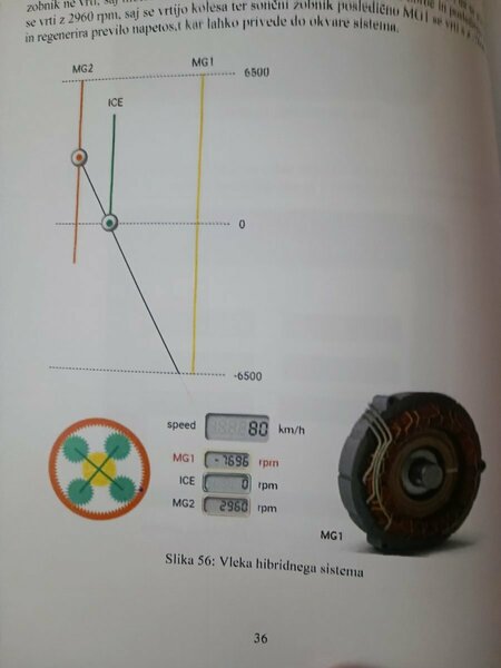 Pa se primer vleke vozila. Na sliki se vidi, kako je v tem primeru ecvt planetni menjalnik povezan z mg1 (motorgenerator 1) mg2 in ice (motor z notranjim izgorevanjem). Vido se da ice miruje torej motor ne laufa, mg2 je povezan z ringom od planetnega gonila (oranzno) ki ga poganjajo kolesa med vleko. Zdaj v planetnem gonilu se prense vrtenje samo tako da ena komponenta stoji in v tem primeru je to ice ker je vgasnjen, za posledico pa ima vrtenje mg1 ki je povezano s soncem planetnega gonola ki se zaradi prestavnega razmerja vrti dosti hitteje v tem primeru s -7700 vrtljajo v kontr smer in s tem regenerira elektricno energijo in polni, kar poskodije baterino in bms. Kar dosti vas ima ful interesa tukaj, bi vas kar imel pri pouku v razredu 😄 -