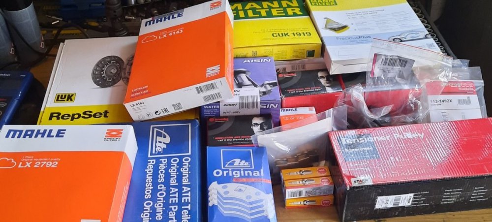 Da vas malo ohladim. Evo dobil velikkkk paket z materialom za mazdo zdaj pa imam vse od vodne črpalke, svečk, filtrov, jermenov, napenjalcec, olja, sklopka, diski, sploščice, puše za stabilizator, tulke za zavorne čeljusti.... vseee 😁😁 (jaz sem tiste sorte ko mora imet vse na zalogi pa če se rabi ali se ne)