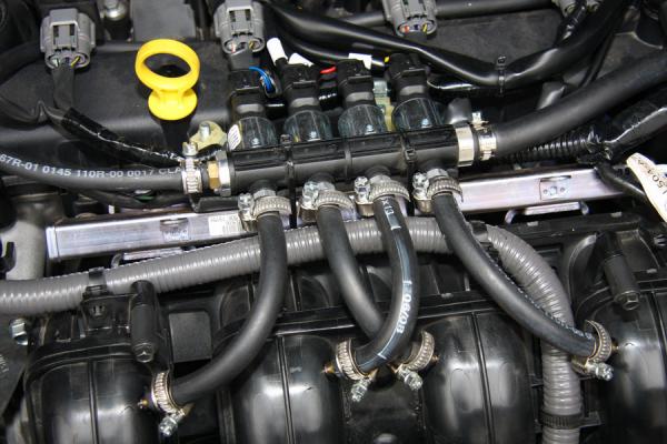 Z vezicami je pritrjen, ker ga druga?e na zelo preprost na?in ne more? pritrditi. Vsaj ne tako, da bi se vse skupaj skrilo pod plasti?ni pokrovom, kar je bil namen, da se ne vidi ne injektorjev, ne kablov, ne ?ob, itd. Te novi injektorji nimajo nikjer kakr?negakoli navoja da bi zadevo pritrdil na kak nosilec. Guma je spodaj zaradi vibracij ja. Meni je va?no v glavnem to, da ko odprem pokrov motorja, da tudi ?e se vidi, da je lepo vse zlo?eno, kar pa tukaj je. Pa ?e ne maram preve? vrtanja po avtomobilu, v kolikor ni nujno potrebno.