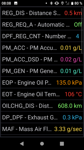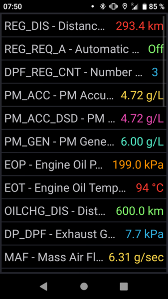 Pozdravljen, jaz sem ga očistil "online" in sem zadovoljen. Regeneracija se izvaja na 220-240km, ni sicer kot prej, ko je bila na okoli 280km, vendar gre. Prevoženih imam sicer okoli 280kkm. Vzrok za hitrejšo regeneracijo pri tebi je lahko tudi kaj drugega, veliko parametrov se lahko prebere s Forscan aplikacijo in obd vmesnikom. Par nasvetov kaj preveriti v aplikaciji: EXHPRES1 - v prostem teku je vrednost okoli 100kpa pri pospeševanju naraste do okoli 300kpa - če to ni ok, potem je po vsej verjetnosti kovinska cevka (SH0120870) polna saj. Lahko pa je tudi senzor, posodobljena verzija (SHY618W00), če imaš še staro verzijo. Cevko se lahko preveri tudi z vakum pumpico, nekateri jo očistijo z gorilcem, da saje zgorijo. Meni je ni uspelo in sem jo moral zamenjati. Če imaš DPF poln, boš po moje najlažje ugotovil po parametru DP_DPF. Tudi ta pri pospeševanju narašča (10 ali več kpa), vendar je po končanem procesu regeneracije vrednost v prostem teku okoli 0. Če je vrednost višja, potem zna biti, da je dpf nekoliko bolj poln. Vendar je dpf kr "trdoživ", kolega ima sedaj verjetno že preko 500kkm in prvi dpf, čistil ga je po metodi, ki mi jo je svetoval (opišem kasneje). Preveri tudi vrednosti PM_ACC, PM_ACC_DSD in PM_GEN. Če je vse ok, se proces regeneracije prične, ko je PM_GEN okoli 6, ostala 2 parametra pa počasi naraščata (pri meni do nekje 1-2). Po končanem procesu so vse vrednosti okoli 0. Če ti regeneracijo prožita PM_ACC oz. PM_ACC_DSD, je lahko vzrok zamašena kovinska cevka morebiti tudi senzor, kot sem zapisal prej. PM_GEN pa je povezan s porabo, hitro naraščanje je lahko tudi posledica slabih injektorjev. Svetujem ti, da spremljaš tudi pristisk olja EOP, kot že verjetno veš so težava teh motorjev podložke injektorjev, kar privede do mašenja sita oljne pumpe,... Zdaj kaj dobro oz. priporočjivo storiti, če še nisi: čiščenje sesalnega kolektorja menjeva sita oljne pumpe menjava podložk injektorjev preveriti stanje odmične gredi - to bi rad sam 1x preveril ;), če morebiti prispeva k nekoliko hitrejši regeneraciji Kako očistiti DPF (hvalijo Wynns Off Car DPF Cleaner) Wynns Off Car DPF Cleaner (18985) | Leader in lubricants and additives WWW.MISTEROIL.EU 5L Recept, ki ga je dal kolega in sem ga tudi uporabil (video prikaz kako očistiti je spodaj - lahko uporabiš tudi čistilo na posnetku): 1. Car idling for about 5 minutes 2. Insert 2 liters of water, in which 1 piece of dishwasher tablets was dissolved by heating the water in the kitchen. 3. Idling for 10 min 4. Insert Home plumber liquid 1l, incl. 10% caustic soda or lye. 5. Let it work for about 1.5 hours 6. Start the car and slowly increase the revs to 5000 revs and down. Liquids fly from the exhaust pipes in an arc several meters away. Coughs a bit at start-up. 7. Rinsing with two liters of water 8. Start the car again and rev up to 5000 revs. Now, as far as I remember, no liquid came out of the exhaust pipe. 8. Insert 2 liters of 10% hydrochloric acid, (RTL acid wash or similar), first 1 liter and after half an hour or an hour another liter. 9. Let it work for about 1.5 hours and then start and rev up to 5000 revolutions. Fluids fly from the exhaust pipes. 10. Rinsing with 4 liters of water in such a way that the fluids enter in 2l batches and in between start again and make rounds. 11. Test drive, during which a lot of liquid comes out of the exhaust pipes during acceleration. However, there is no more steam, but they come out as a liquid. Testiranje, če je kovinska cevka zamašena: Še števec kolegove mazde (stanje april 2024) lp, Samo -